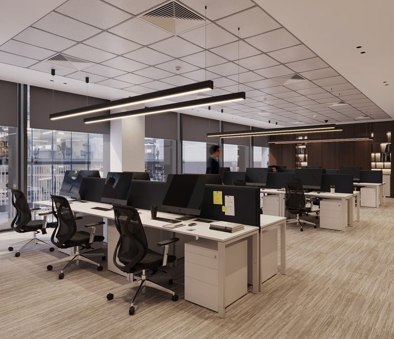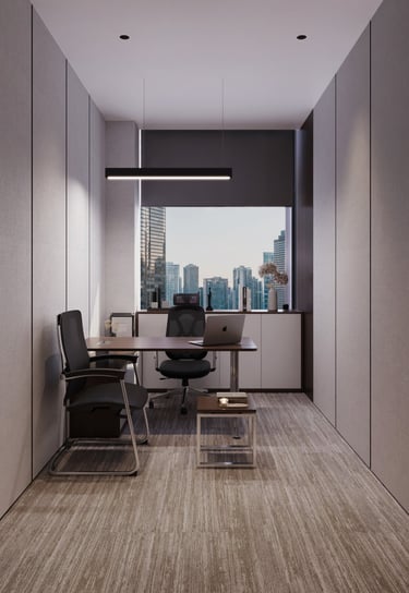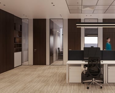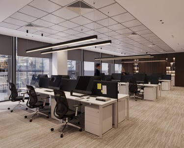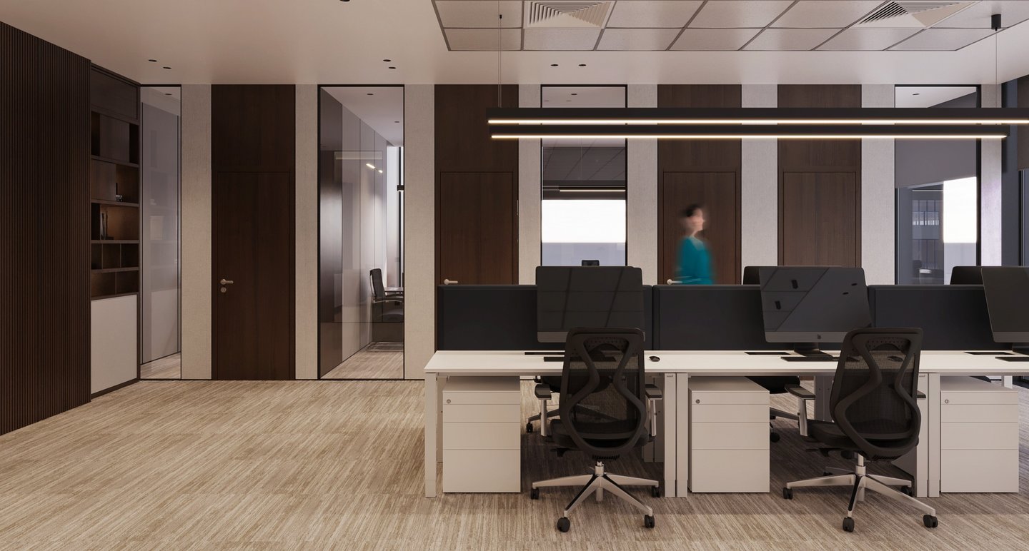 Thoughtful space planning combined with ergonomic and adaptable furnishings to enhance productivity and create a versatile office environment that meets the diverse needs of its occupants.