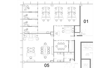 Adjacent to these are larger open work areas with desks arranged in cluster suitable for collaborative work or hot-desking. The center-left section features a lounge or waiting area equipped with sofas and chairs providing a comfortable space for informal meetings or relaxation.
