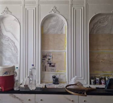 Combining classical elegance with modern minimalism while using neutral color palette of warm whites, creams, and wood tones to create a calming atmosphere while the black marble flooring with gold accents enhances the luxurious vibe.