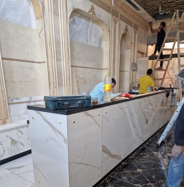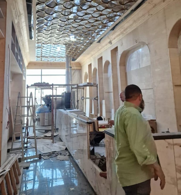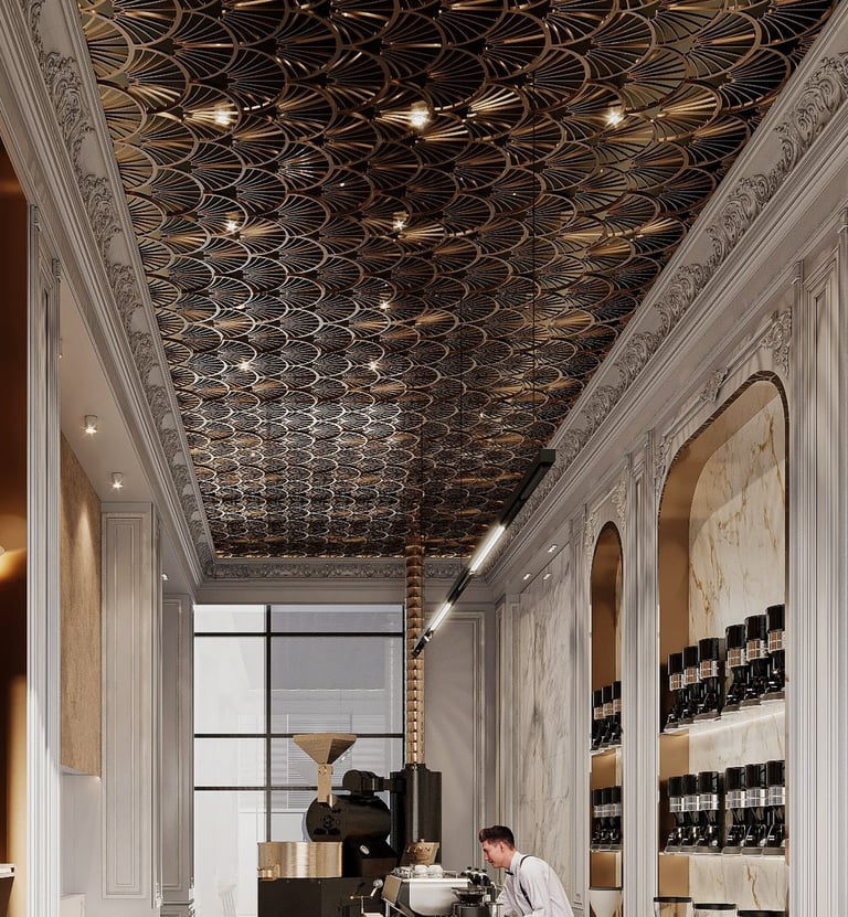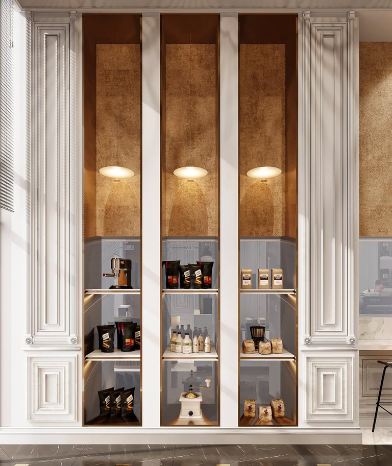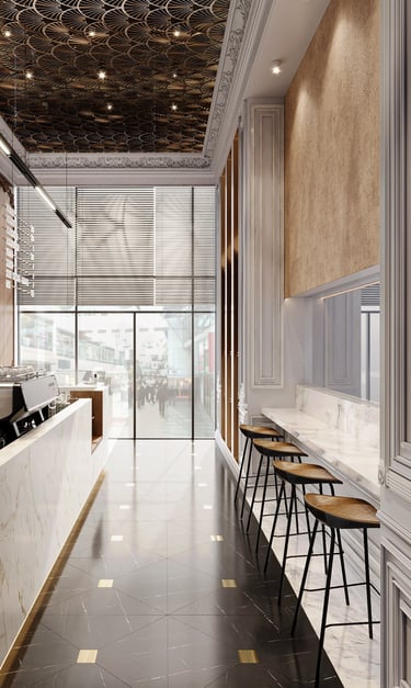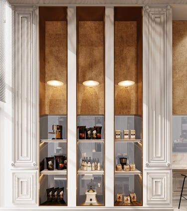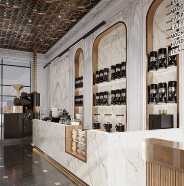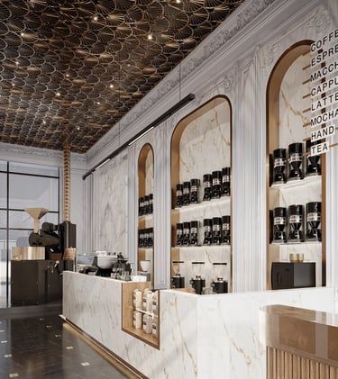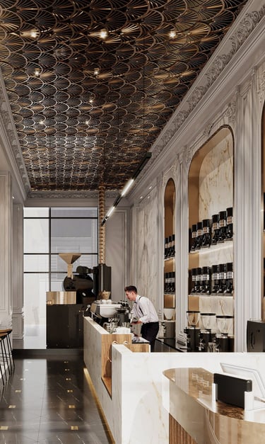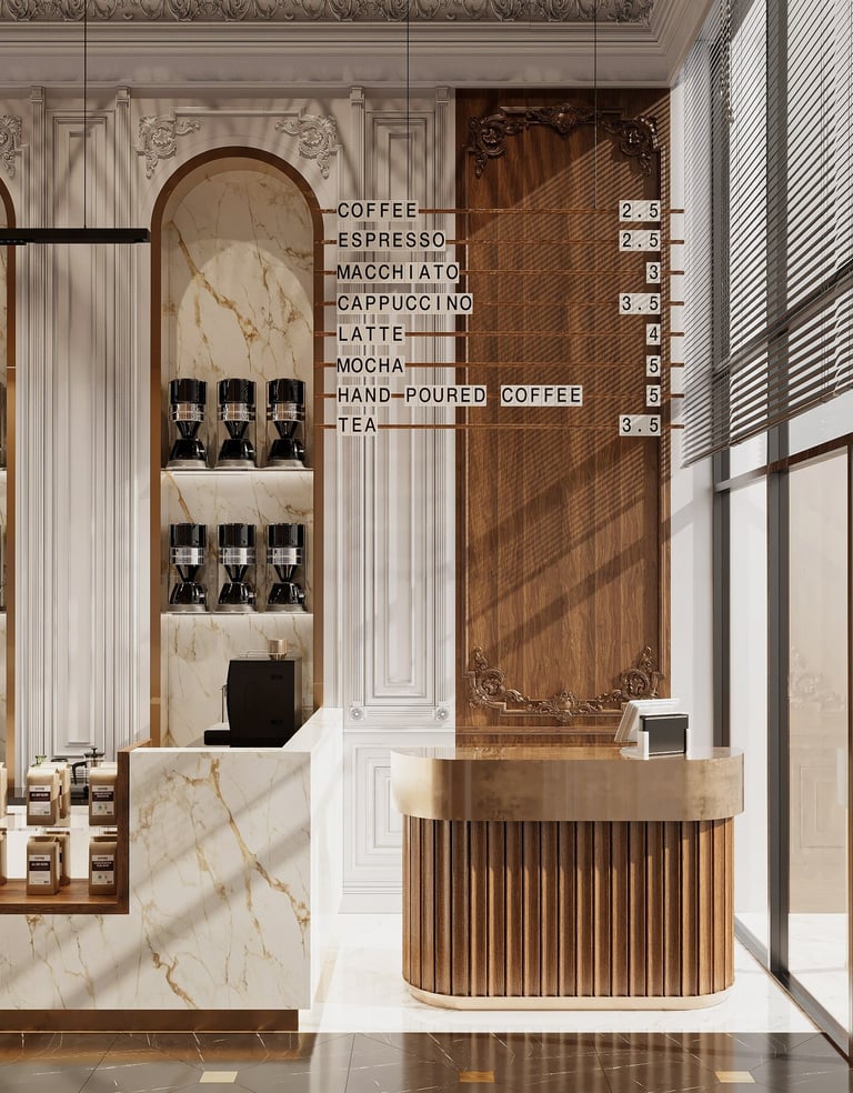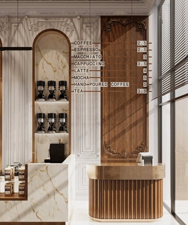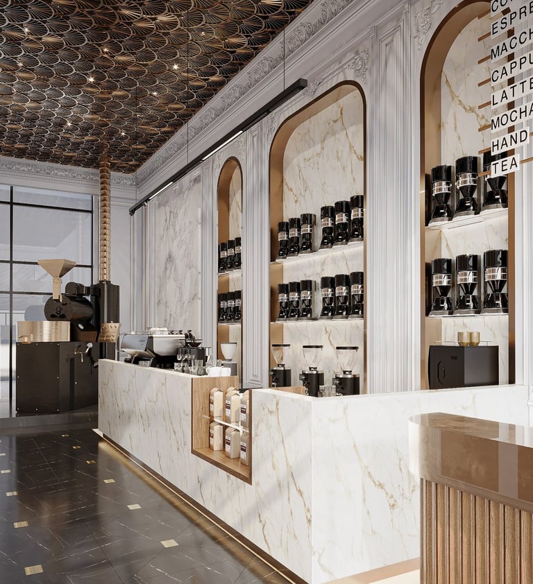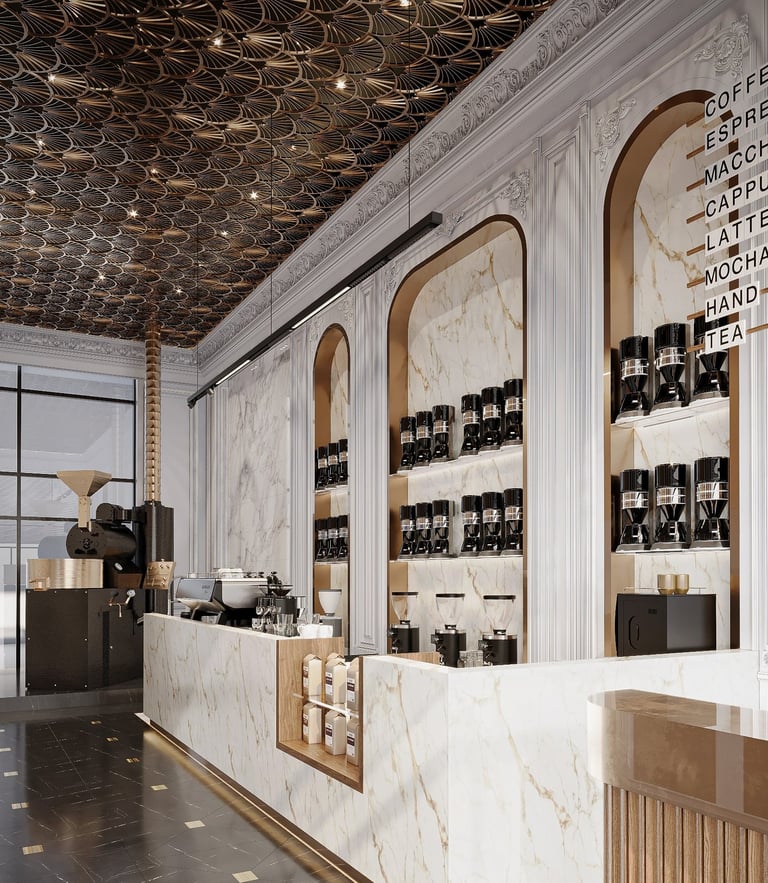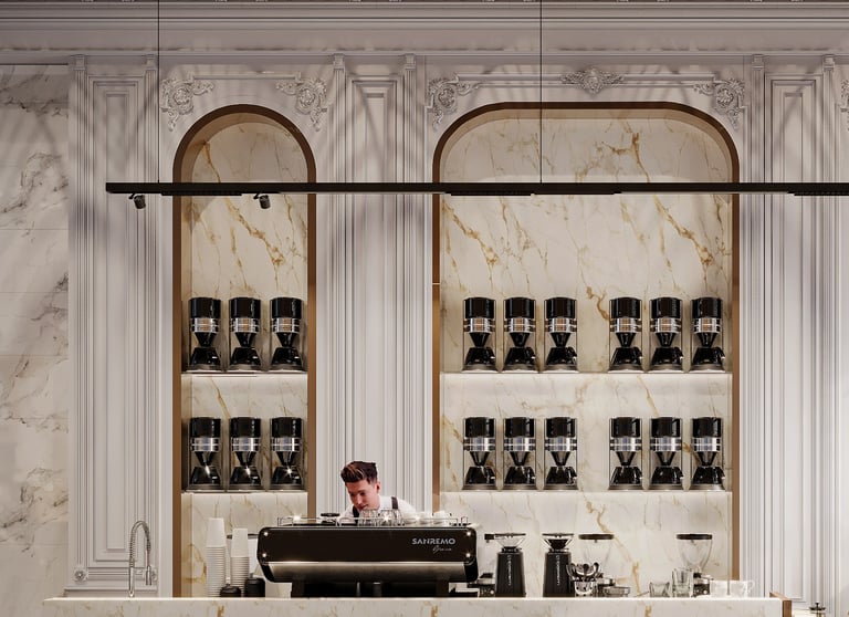 Combining traditional and modern design elements to create an inviting upscale environment that highlights both luxury and attention to detail in coffee preparation aiming for a harmonious balance of luxury and functionality.