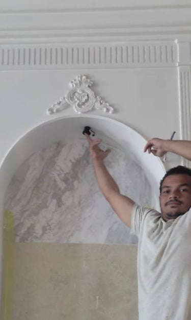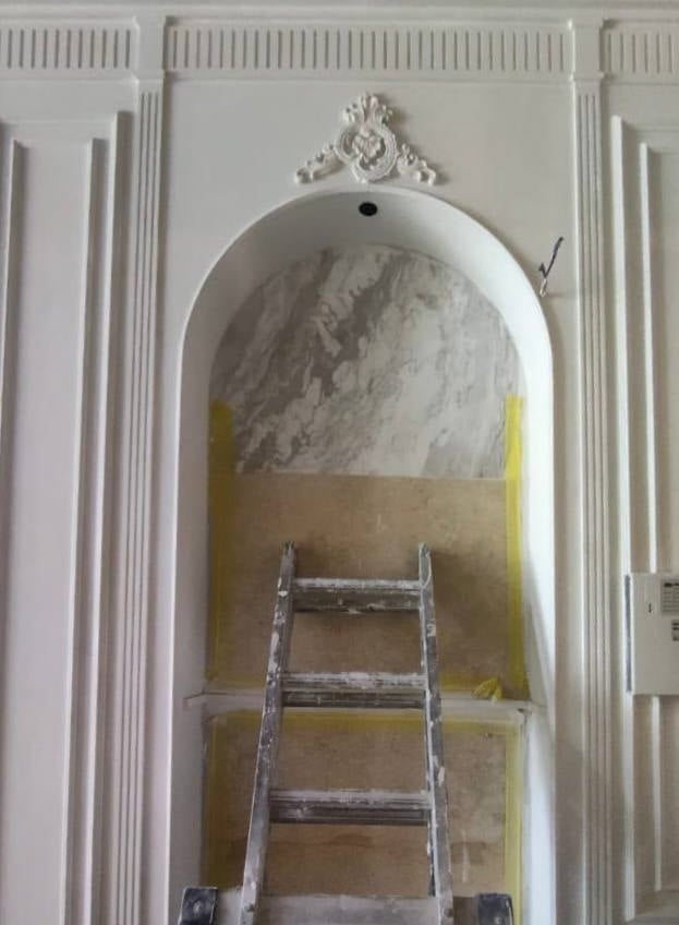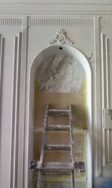 The intricate molding and carved wood panels evoke a traditional European style adding sophistication and grandeur to the space.
