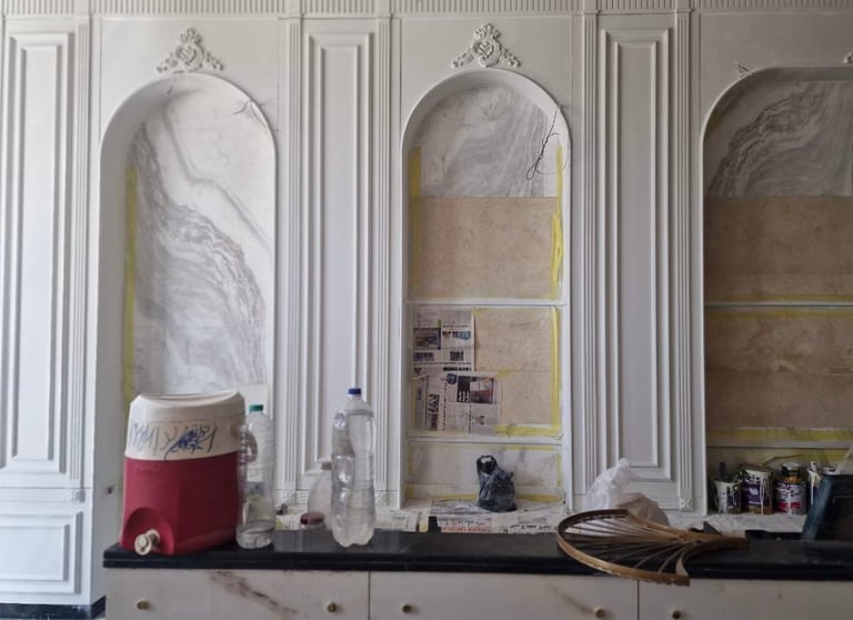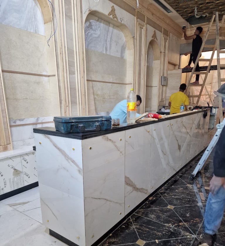 Luxurious materials such as white and gold marble are used on countertops and wall panels contributing to a high-end polished feel.