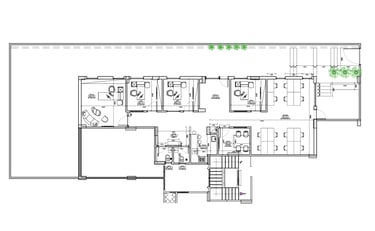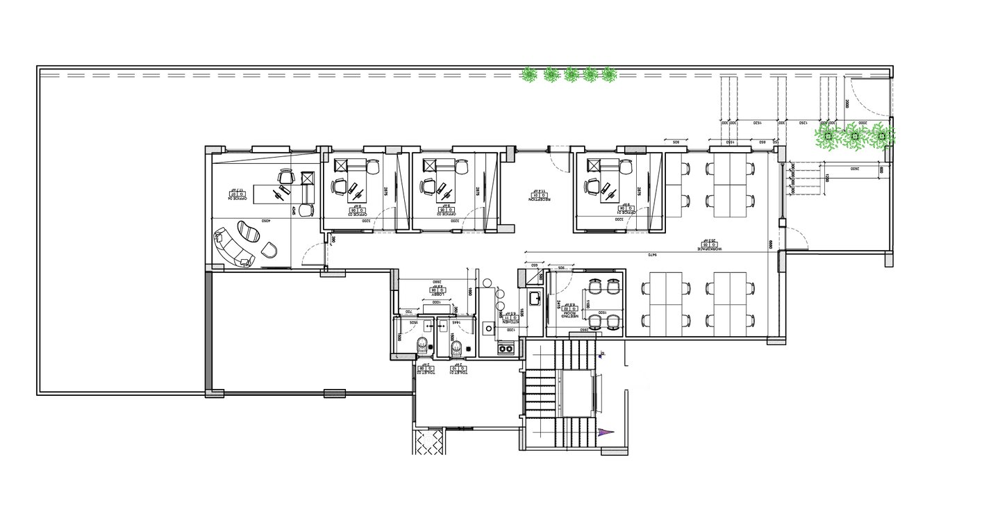 Meeting rooms of various sizes are equipped for different purposes. Essential amenities like restrooms, a pantry, and storage are conveniently located. Greenery and an outdoor area enhance the environment. Overall, the plan balances private and collaborative spaces, creating an efficient and versatile work environment.