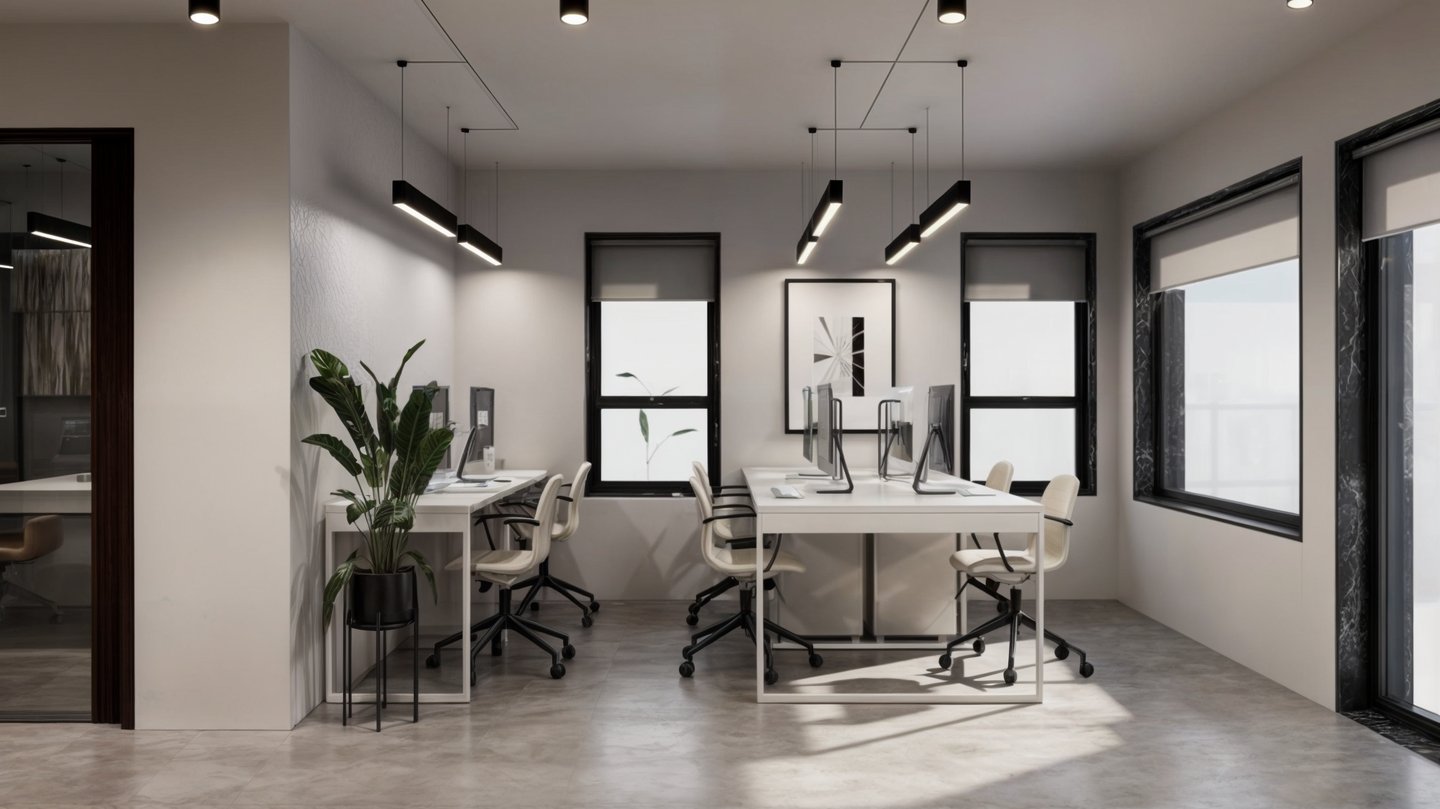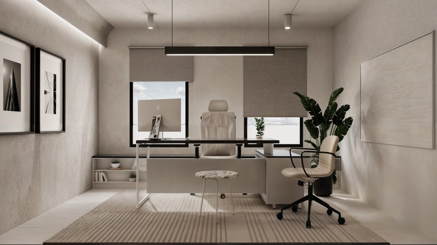 This approach not only enhances the visual appeal but also fosters a calm and focused atmosphere, ideal for a modern work setting.
