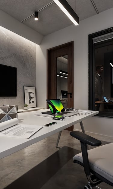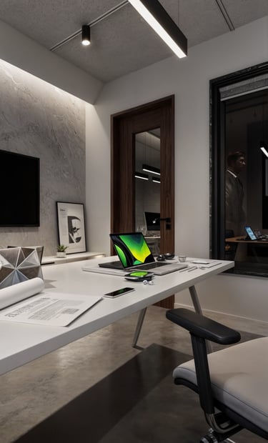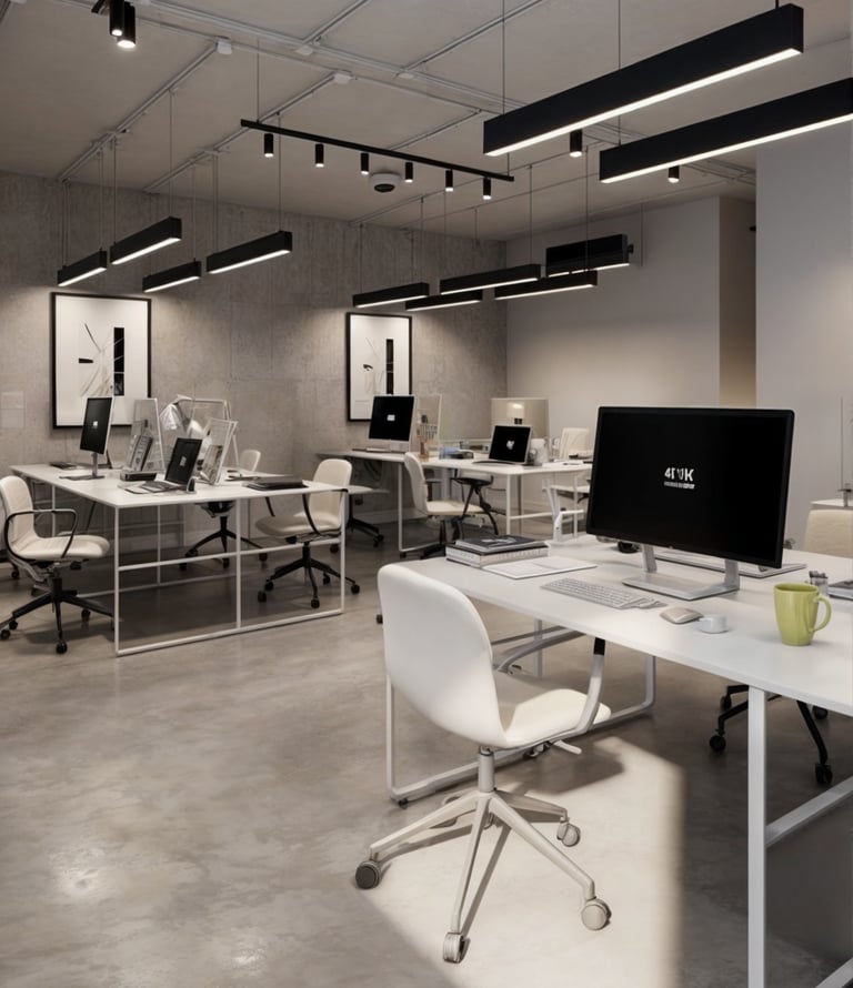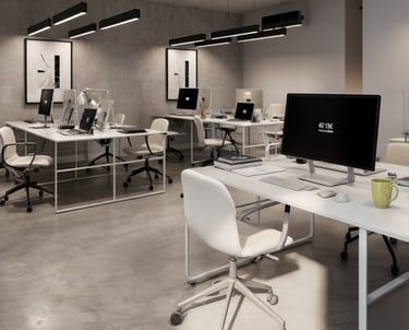 The office layout features simple sleek furniture with a focus on functionality where the desks are designed with minimalistic aesthetics offering clean surfaces that help maintain an organized workspace.