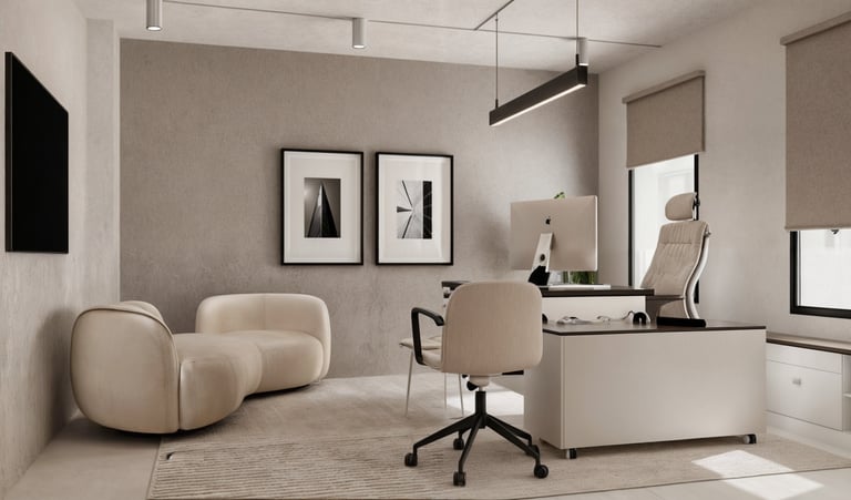 The interior style of this office exemplifies minimalism through its clean lines, neutral color palette, and functional furnishings. The space is designed to maximize natural light, with large windows that allow for ample daylight, enhancing the sense of openness.